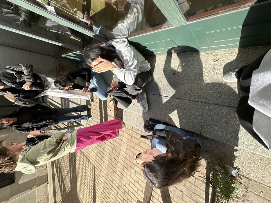 The image depicts six individuals gathered on an urban sidewalk and steps in the city of Madrid, Spain, under bright sunlight. The scene is viewed from a low perspective, showing the photographer's lower legs and feet in the immediate foreground, wearing dark pants and a grey sweatshirt. In the middle ground, two young adult females are seated on grey granite steps. The female on the left has long dark hair, wears a dark long-sleeved top and blue jeans, and holds a black smartphone in her left hand while her right hand partially obscures her face. A black shoulder bag rests beside her. To her right, a second female with long dark hair, wearing a light grey hooded sweatshirt, dark pants, and grey Adidas sneakers, is also seated on the steps, holding a smartphone in her left hand with her right hand covering part of her face. A gold-toned watch is visible on her left wrist. Three other young adults are standing on the patterned tan sidewalk. On the left, a female with light brown hair tied up wears an olive-green hooded sweatshirt and bright pink wide-leg pants; she is smiling and looking left, appearing to wear wired earbuds. Adjacent to her, a female with long dark hair, dressed in a dark jacket over a dark top and blue jeans, stands looking upwards. Further back and to the right, a male with dark hair, wearing a dark patterned jacket over a light garment and white wide-leg pants, stands with his right hand near his head, possibly adjusting an earbud. The environment features a building with a dark green wooden door or window frame containing reflective glass. The ground comprises light brown patterned pavers on the sidewalk and grey granite steps. Strong, low-angle sunlight casts prominent, elongated shadows of the individuals and a railing onto the ground and steps. A small, flattened cardboard box is present on the sidewalk near the standing individuals. A patch of green vegetation is visible in the lower-left corner.
