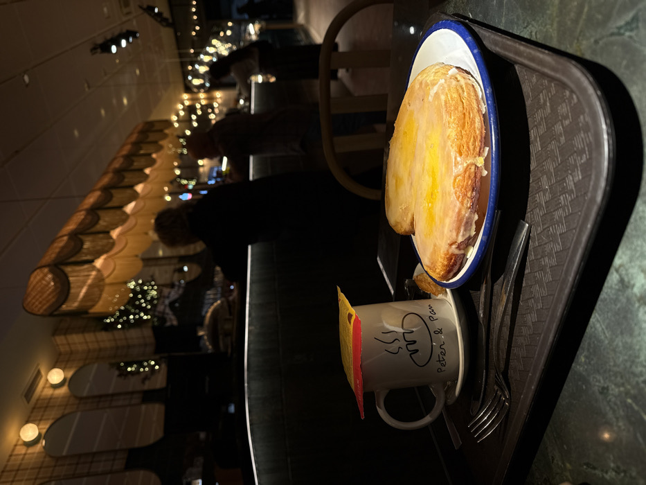 - "A tray holds a pastry in a blue-rimmed dish, a mug with "Peter & Pan" written on it, and utensils" by FM-PDjLC3, licensed under CC BY 4.0
