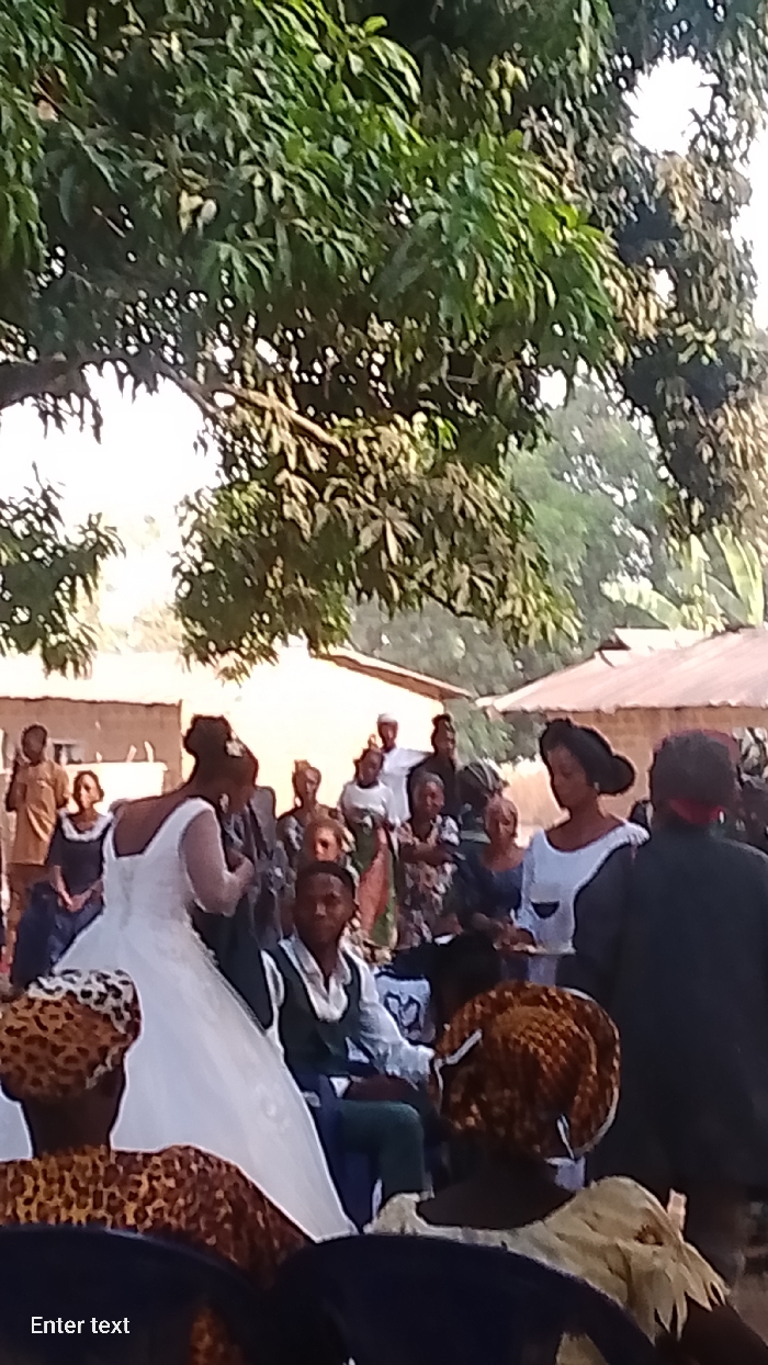 An outdoor gathering is depicted in daylight within the city of Akwanga, Nigeria. The scene features approximately 20-30 individuals congregated under large leafy trees, with residential structures topped with reddish-brown corrugated metal roofs visible in the background. Central to the foreground is a female subject, primarily seen from the back, wearing a white wedding gown and an up-styled dark hairstyle. To her immediate right, a male subject is seated on a blue plastic chair, dressed in a green vest over a light-colored long-sleeved shirt and dark green trousers, looking towards the viewer. This male is likely the groom. Further to the right, another female subject stands, wearing a white top with dark sleeves and a dark headwrap. Attendees are positioned throughout the frame, both standing and seated on blue plastic chairs. In the immediate foreground, two subjects are visible from the back, wearing patterned garments and headwraps (one leopard print, one brown woven pattern). Other individuals in the midground and background wear various attire, including traditional Nigerian fabrics and headwraps. Interactions primarily involve observation and gathering. The environment appears to be an open area, possibly unpaved, within a community setting.