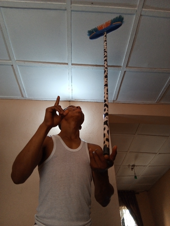 An adult male, of dark complexion and wearing a white ribbed tank top, is depicted indoors from a low-angle perspective, balancing a broomstick vertically on his right hand