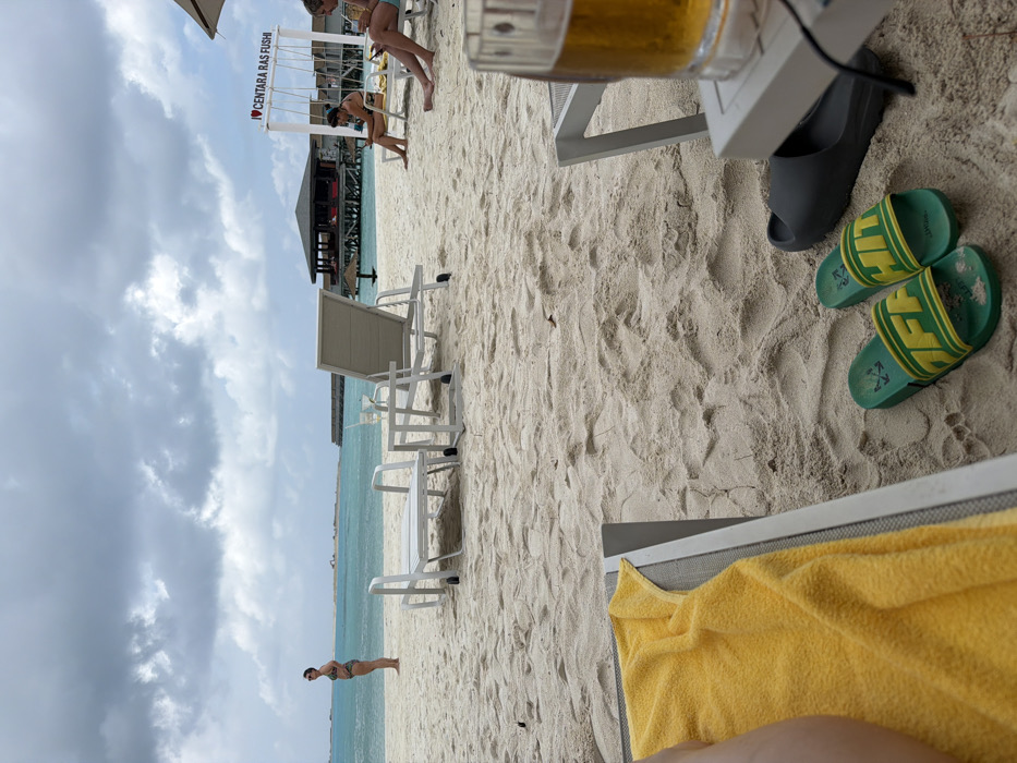 beach scene with white sand. There are several people on the beach, including one standing in the water. A couple of beach chairs are visible. A beer in a glass, a pair of slides, and a pair of green sandals are visible on the sand. A yellow towel is partially covering the bottom right corner of the frame. The sky is cloudy.