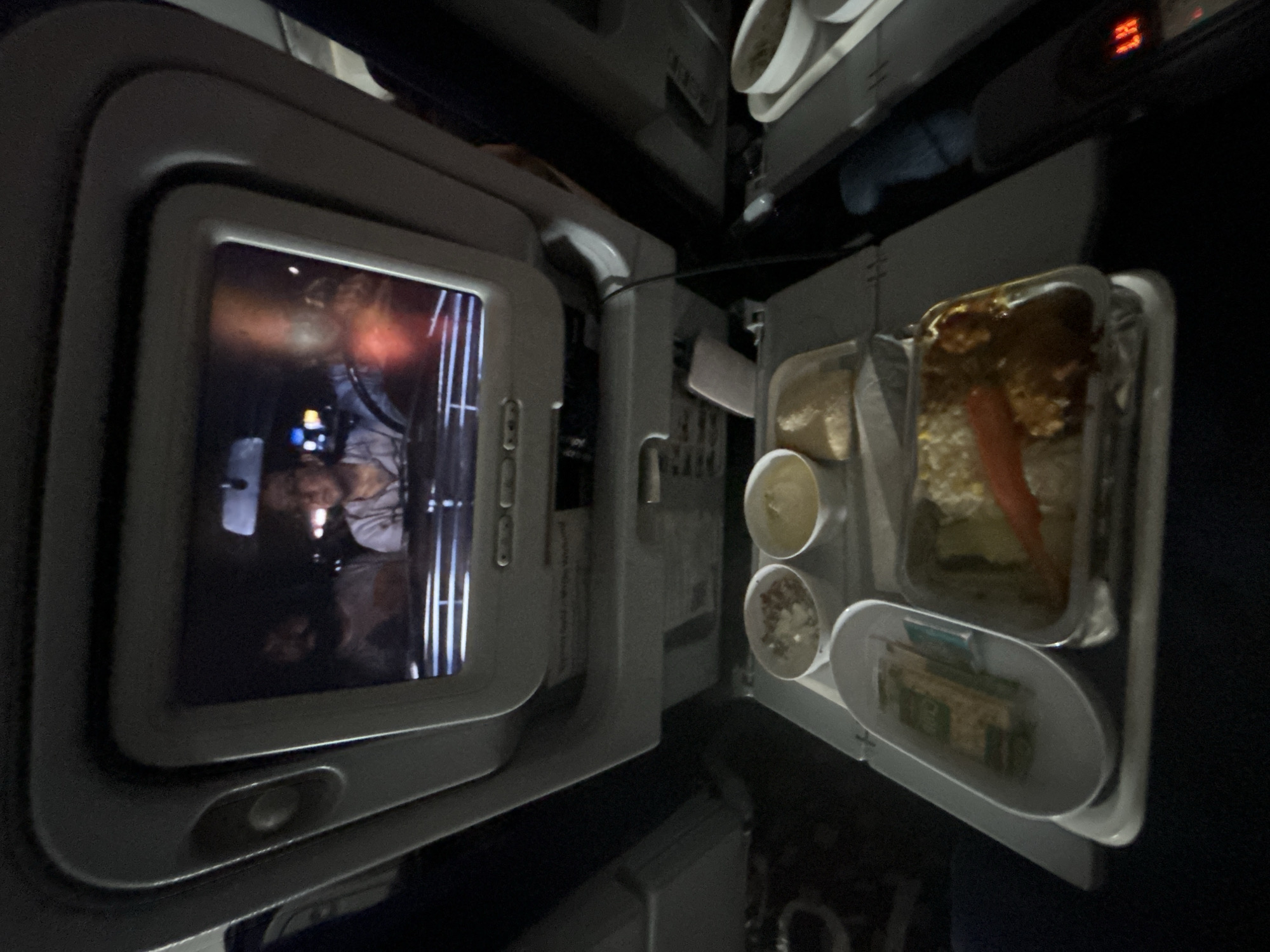 n airline seat with a meal tray open. The in-flight entertainment screen displays a person. The meal tray contains several dishes. The setting appears to be inside an airplane cabin. There is no information to suggest this photo was taken in Frankfurt, Germany, or any other specific city.