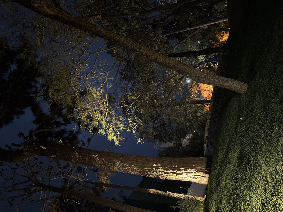 The image captures a nighttime outdoor scene in Tetela Del Monte, Mexico. A sloped grassy area, illuminated by warm artificial light, occupies the foreground, featuring a small, light-colored spherical object near its center. Several trees rise throughout the frame; their trunks and lower branches are highlighted by warm uplighting, contrasting with the shadowed upper foliage. A large tree trunk stands prominently in the left-center, brightly illuminated. Another tree angles from the lower right towards the upper center. In the mid-distance, a dark stone retaining wall is visible, separating the foreground from a slightly elevated area where faint structures, some emitting a warm orange glow, are discernible. The sky overhead is dark blue, consistent with nighttime conditions. No individuals or overt activities are present.
