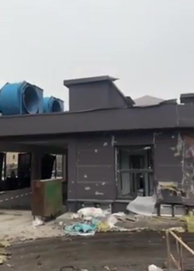 aftermath of an apparent explosion in an urban area. A low building is heavily damaged, with broken windows and debris scattered around it. A tall, modern apartment building nearby also has significant damage, with a gaping hole in its facade revealing insulation and internal structure. Windows are shattered, and the building’s exterior is marked with numerous smaller impacts. Several people, including emergency personnel, are present at the scene, observing the damage. A car is heavily damaged, its windows shattered and the bodywork scorched. The overall atmosphere is one of destruction and shock, with debris and damage indicating a powerful explosion or impact. The sky is overcast, and the scene appears to be cordoned off with red and white tape.