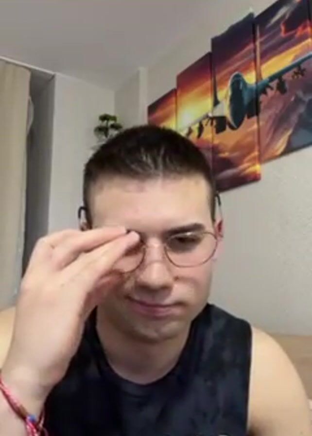 A young man with short dark hair, wearing a black tank top with the "MP" logo, puts on round wire-frame glasses and smiles at the camera. He points at the camera. Behind him is a wall with three framed images of an airplane against a sunset sky. A small shelf with a miniature tree is visible on the left. The lighting is soft.