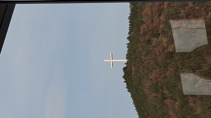 A large white Christian cross stands prominently atop a densely forested hill, Mount Varosha, overlooking Blagoevgrad, Bulgaria. The cross is centered against a clear, pale blue sky that occupies the upper third of the vertical frame. The hillside below the cross is covered with a mix of dark green coniferous trees and deciduous trees displaying predominantly brown or sparse foliage. The lower portion of the image reveals faint, translucent reflections on a glass surface, presenting indistinct, irregular shapes superimposed over the background forest. Dark, linear architectural elements, consistent with a window frame, are visible along the top and right edges of the photograph. No individuals or active scenes are depicted.
