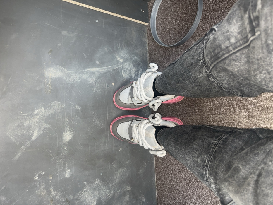 From a first-person perspective, the image shows a person's legs clad in dark-washed jeans, standing on a dual-surface floor. The left side features a worn, dark gray linoleum with scuff marks, while the right side is carpeted in a beige-brown hue. The person is wearing white sneakers with pink soles and thick, white laces. A circular, gray object is partially visible near the right-side carpeted area.