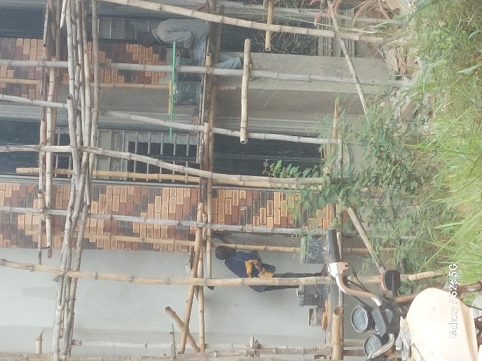The scene depicts an active construction site in Umudioka, Nigeria. A multi-story building, partially enclosed by a bamboo scaffolding system, is in the process of construction. The visible portion of the building displays two distinct finishes: a smooth, light-colored wall on the left and a central section featuring a patterned facade of light brown and dark brown bricks. Multiple windows with dark frames and vertical security grates are observable throughout the structure. Two male individuals are positioned on separate levels of the bamboo scaffolding. On the lower-left platform, one male, attired in a dark shirt with yellow detailing and dark trousers, stands facing the building wall, engaged in applying a substance to its surface. Several dark-colored buckets are located on the scaffolding platform adjacent to him. On a higher platform towards the right, a second male, wearing a light grey long-sleeved shirt and blue jeans, is seated on a horizontal bamboo pole. A green rectangular object and a dark bucket are situated on the scaffolding near this individual. The ground level in the foreground is covered with green grasses and small bushes. The front section of a light-colored motorcycle, including its handlebars and part of the fuel tank, is visible in the lower-left corner of the frame. A "Galaxy A52s 5G" watermark is present on the motorcycle's tank.