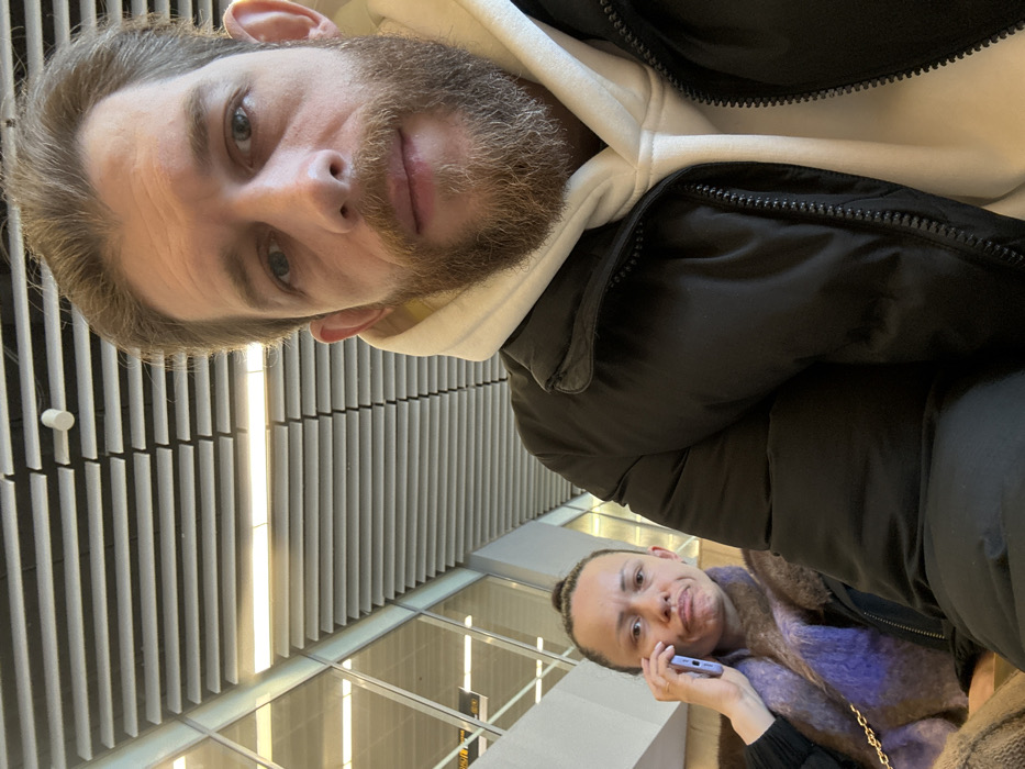 The image depicts two individuals in an indoor public waiting area, specifically located in Khrabrovo, Russia. In the foreground, a light-skinned male with a light brown beard and hair, wearing a white hooded sweatshirt under an unzipped black puffer jacket, is positioned directly facing the camera, indicating a self-portrait. His expression is neutral. To his left and slightly behind him, a light-skinned female with dark hair styled in a bun is seated, holding a light purple smartphone to her left ear, indicating an ongoing conversation. She wears a dark garment and a textured purple and brown scarf, displaying a slight pout. The environment features a modern interior with a slatted ceiling structure containing integrated linear lighting, and large glass windows to the left. A blurry digital display, showing white text on a dark background, is partially visible through the glass, consistent with airport gate or flight information.