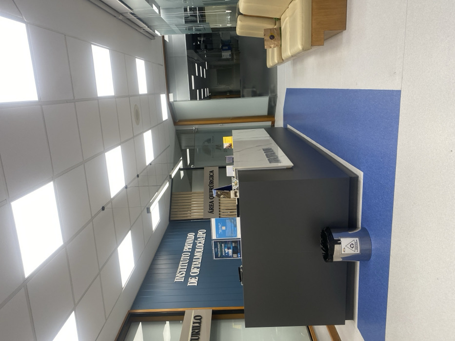 reception area of a medical facility. A light-colored seating area is near a hallway with glass walls. The reception desk is dark gray with a light countertop. A blue accent wall behind the desk reads "INSTITUTO PRIVADO DE OFTALMOLOGIA IPO" and "AREA QUIRURGICA." A wastebasket sits near the desk, and bright ceiling lights illuminate the space.