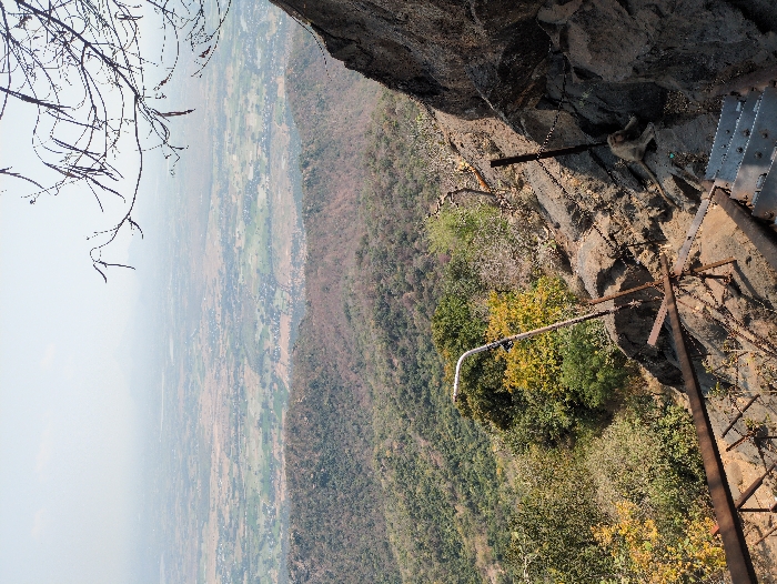 The image displays a panoramic view from an elevated position in Kadaladi, India, looking down onto an expansive landscape. In the lower right foreground, a metallic staircase with rusted handrails descends a steep, rocky incline. A light brown monkey is positioned on the rock face to the right of these stairs. Immediately to the left of the staircase, a white, L-shaped street light pole is affixed to the terrain, surrounded by varied green and yellow-toned foliage. Bare, dark tree branches with slender seed pods extend into the upper right corner of the frame. The mid-ground consists of densely vegetated hills, exhibiting a spectrum of green and autumnal brown colors. The distant background reveals a vast, hazy plain characterized by a patchwork of agricultural fields and dispersed buildings, extending towards a faint mountainous horizon under a pale, overcast sky. No human figures are present.