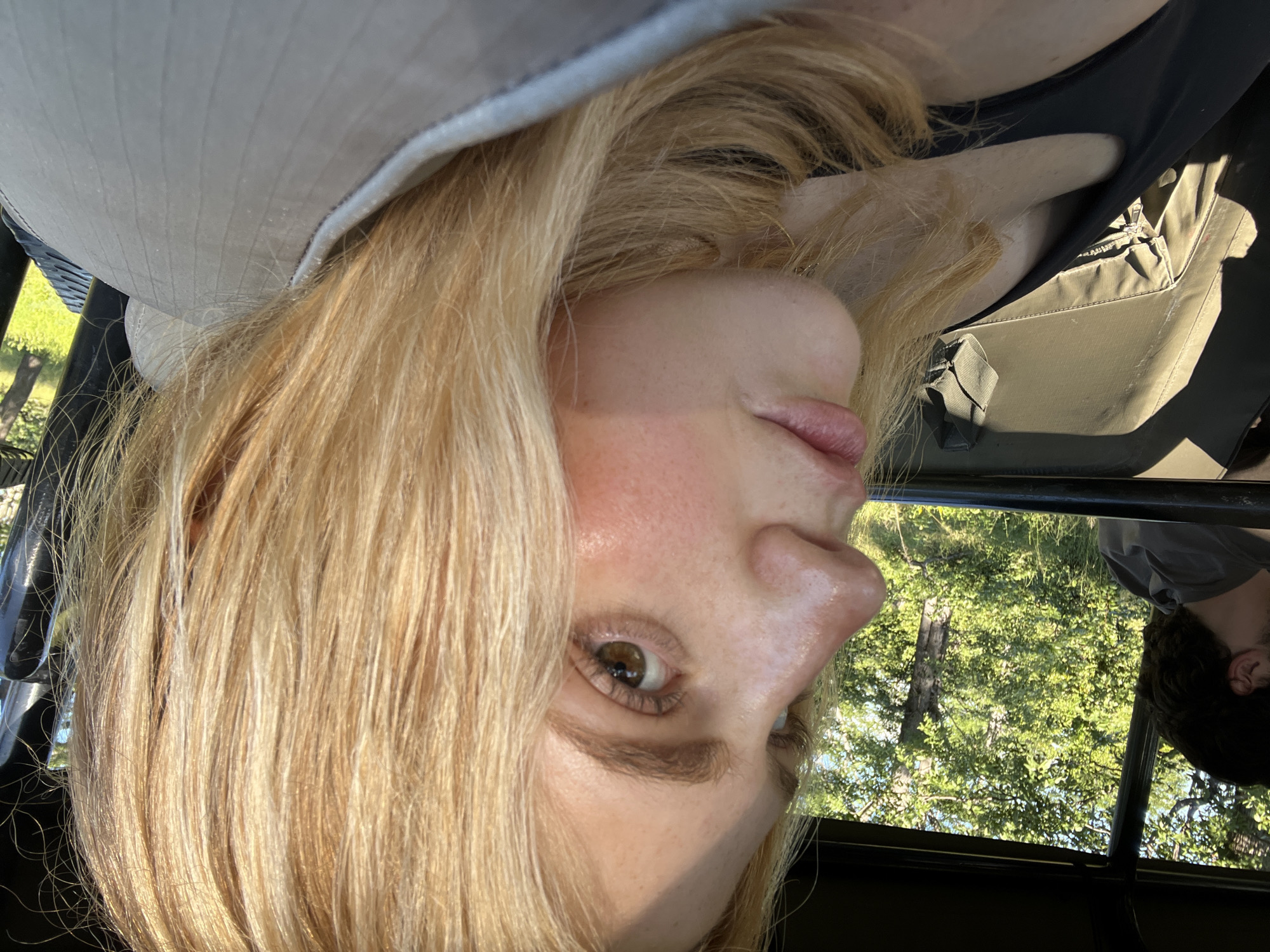 A medium shot shows a woman with blond hair wearing a hat, seen from inside a vehicle in Khwai, Botswana. The scene includes a view through the vehicle's open top, revealing trees and greenery characteristic of the area's environment. Part of another person's head is visible near the vehicle's frame, indicating their presence alongside the woman in the photograph.