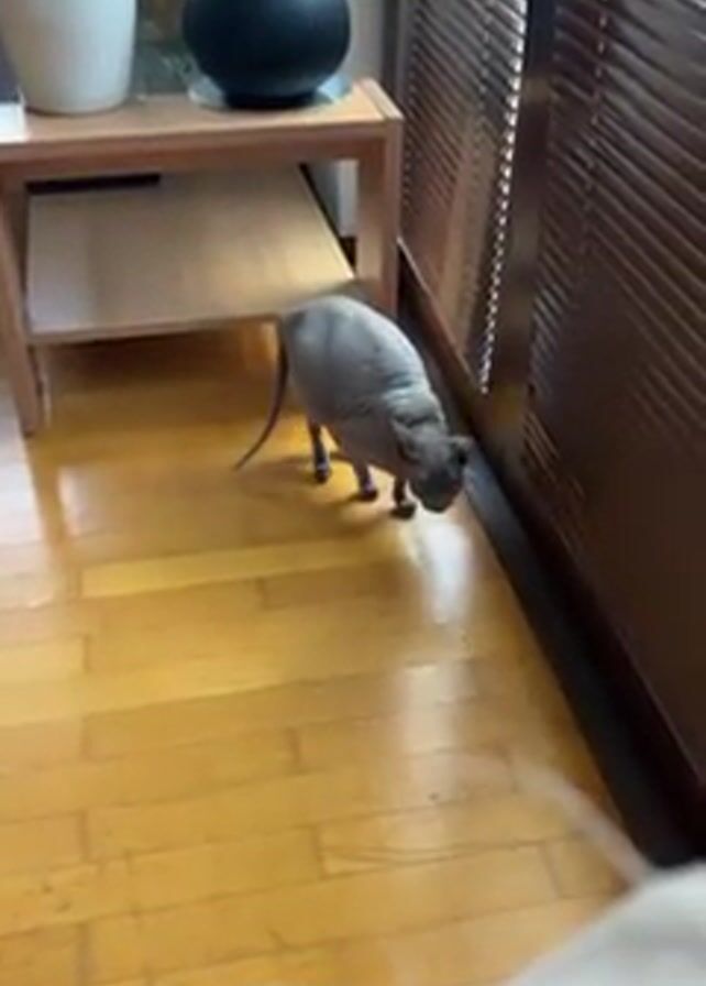 - "A gray Sphynx cat walks on a wood floor towards the edge of the frame and stops to look towards the right" by FM-mUsH73, licensed under CC BY 4.0