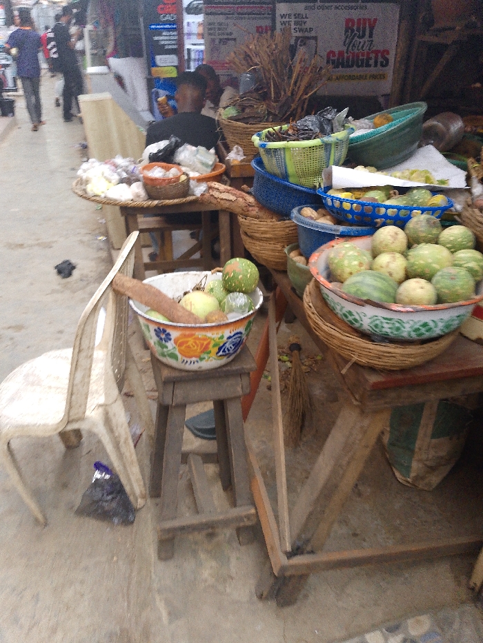 A bustling marketplace scene unfolds with vendors displaying their goods. A variety of fruits and vegetables are arranged in colorful bowls and baskets, perched atop wooden tables and stands. A white plastic chair sits adjacent to one of the stands. In the background, people stroll along the sidewalk, while signs advertise gadgets and accessories.