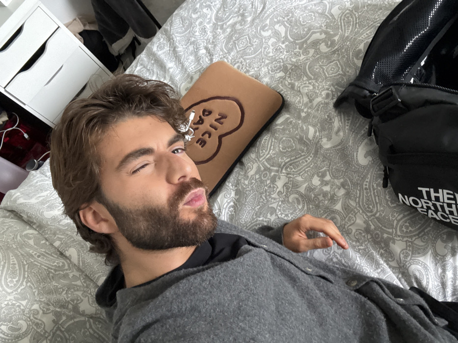 In Chambœuf, France, an indoor scene depicts a male individual lying on his back on a bed
