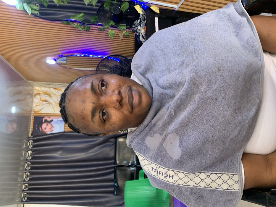 The image depicts an indoor scene within a hair salon located in Jos, Nigeria