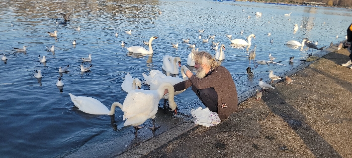 The image depicts a daytime scene at the edge of a large body of water, identified as likely The Serpentine in Hyde Park, London, United Kingdom. In the foreground, a crouched individual with long, light-colored hair and a prominent beard, wearing a dark brown sweater, is actively feeding several birds. Their hands are extended towards approximately ten large white swans gathered on the concrete bank and in the shallow water. Some swans have their heads lowered, appearing to consume food from the bank. A white, possibly plastic, bag or container rests on the concrete near the person, alongside visible scattered food particles. Numerous gulls of varying sizes are present, both swimming on the rippling blue water and standing on the concrete edge. Smaller brown birds are also visible on the concrete. A second person's lower legs and feet, clad in light-colored footwear, are partially visible on the far right. The water's edge meets a grey, textured concrete bank. The background shows more birds on the water, with distant park elements or boats faintly discernible across the expanse. The scene is illuminated by natural sunlight, indicating clear weather.
