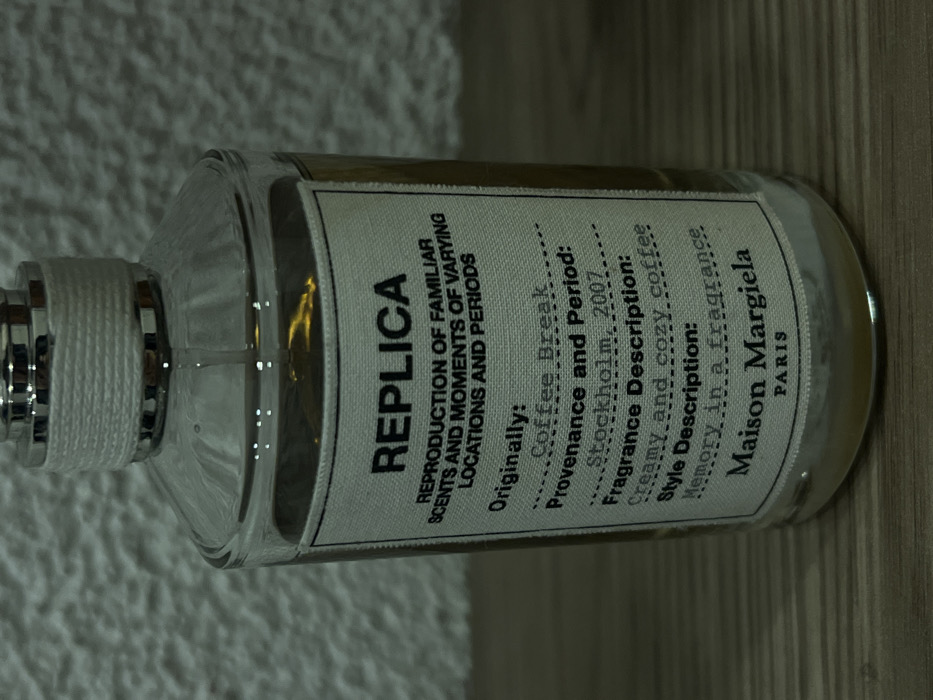 A clear glass perfume bottle with a silver cap and white twine is displayed on a neutral surface. The label reads "REPLICA" in bold, followed by "REPRODUCTION OF FAMILIAR SCENTS AND MOMENTS OF VARYING LOCATIONS AND PERIODS." Details include "Originally: Coffee Break," "Provenance and Period: Stockholm, 2007," and "Fragrance Description: Creamy and cozy coffee." The label finishes with "Style Description: Memory in a fragrance" and "Maison Margiela PARIS."