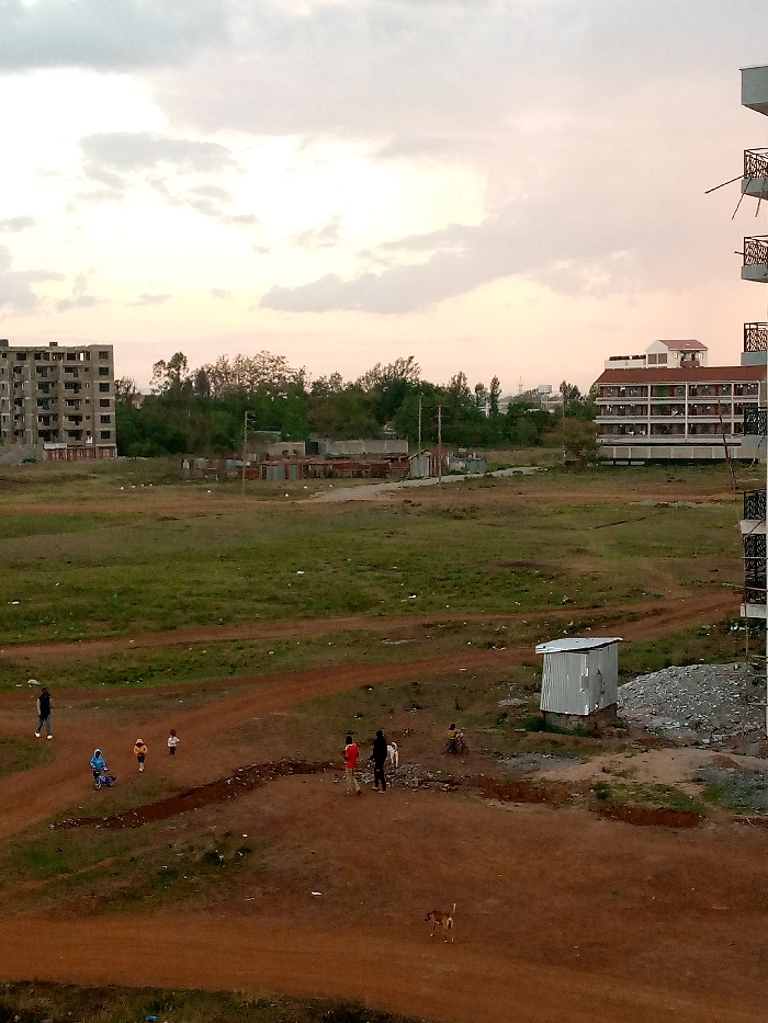 An expansive view shows a grassy field transitioning to barren earth. An unfinished building and an occupied apartment structure flank the scene. A cluster of people gathers on the dirt path; one person is walking a bicycle. A metal shed and pile of rocks rest adjacent. A lone dog traverses the dirt. The sky is overcast, with pinkish light breaking through the clouds.