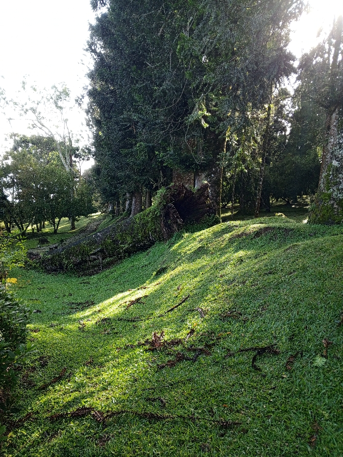A sun-drenched, grassy hillside dips into a shallow swale. Tall, mature trees line the top of the ridge, their trunks illuminated by sunlight filtering through the canopy. A large, moss-covered fallen tree rests on the slope. The ground is lush with green grass and scattered dark debris. The scene is bathed in warm, natural light.