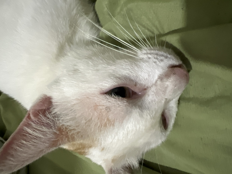The image displays a close-up, angled view of a domestic cat resting on a light green textile surface. The cat is predominantly white with patches of light ginger or orange fur visible on its left ear and forehead. Its head is oriented with the left side facing the viewer, slightly tilted down. The left eye is partially open, revealing a dark pupil and a visible, pinkish third eyelid; small flecks of debris are noted near the eye and on the bridge of the pinkish nose. Multiple long, white vibrissae extend from the muzzle. The environment is an indoor setting, located within the city of Cam Đức, Vietnam.