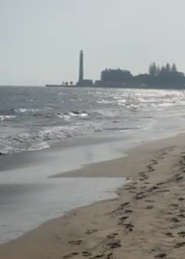 beach with waves lapping at the shore. In the distance, there is a lighthouse and some buildings. There are footprints in the sand on the beach. The sky is hazy and the light is muted.