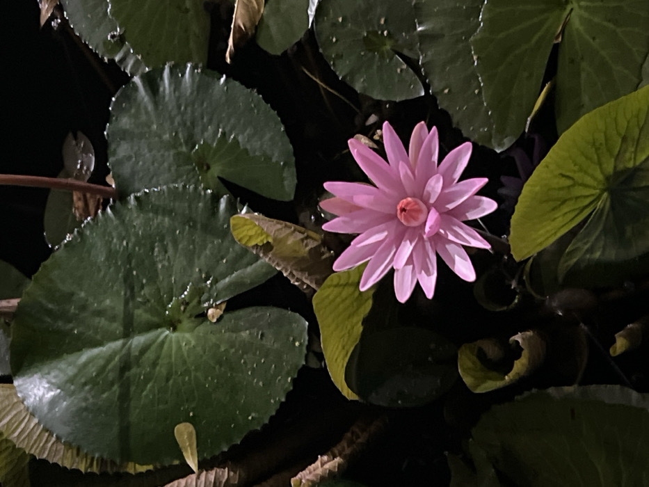 The image depicts an aquatic scene under low light conditions. A single, open pink water lily flower, featuring numerous radiating petals and a prominent pink and yellow-orange central structure, is positioned centrally in the lower half of the frame. The flower is distinctly illuminated, contrasting with the surrounding dark water. Several large, round, dark green water lily pads with textured surfaces or water droplets float on the water, surrounding the flower. Smaller, lighter green, partially unfurled leaves are visible to the left and bottom. The scene is located in Thôn 1, Vietnam. No human subjects or discernible man-made objects are present.
