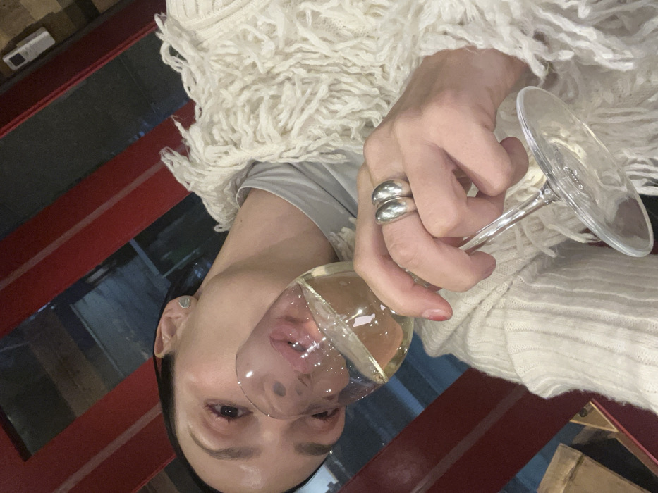 A person is depicted from an oblique, upward-angled perspective, appearing to take a selfie while holding a wine glass. The subject's face is partially visible, with dark hair pulled back, revealing a left ear adorned with a small stud earring. The left eye shows a reddish hue. A clear, stemmed wine glass containing a pale yellow liquid is held to the subject's lips. The left hand, displaying manicured nails with light pink polish, wears a prominent silver-toned ring with two conjoined, rounded segments on the ring finger. The subject is wearing a light gray top layered with an off-white, shaggy, fringed sweater or cardigan. The background features two diagonal red structural elements, likely beams or window frames, against a darker, indistinct background. In the upper right corner, a white wall-mounted device, possibly an air conditioning control unit or thermostat, is visible. The specific location within Osaka, Japan, cannot be ascertained from the visual evidence in the image.