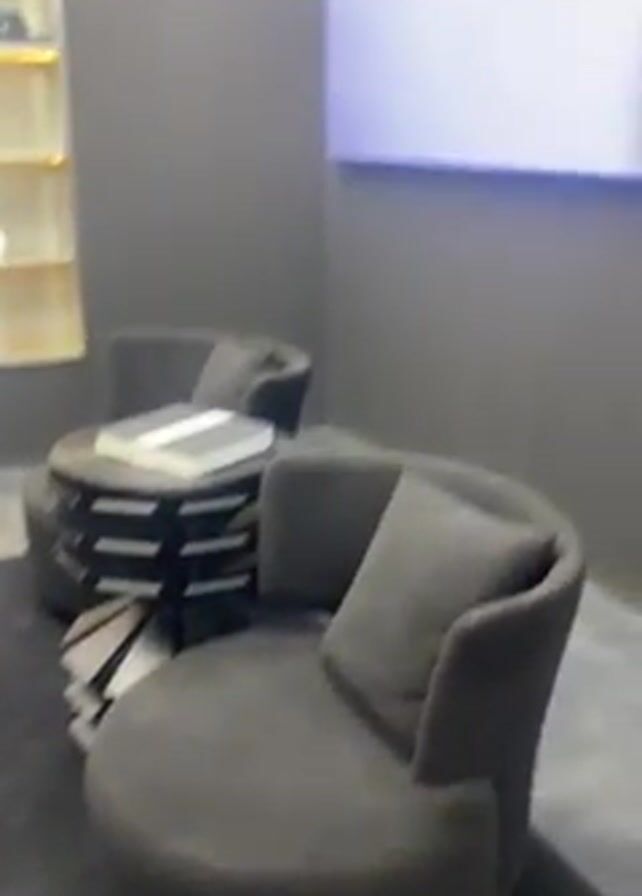 n interior area of a Y-3 branded space, perhaps a retail store or showroom. The color scheme is mostly gray and black, creating a sleek, modern atmosphere. A grey rug lies on the floor. There are two grey, round armchairs with square pillows on them and a small, tiered, black table between them. A book rests on top of the table. The walls are textured and colored black. A rectangular display case with glass shelves mounted on the wall features an assortment of sneakers. Above it is the Y-3 logo illuminated in white. The floor is concrete, adding to the modern aesthetic.