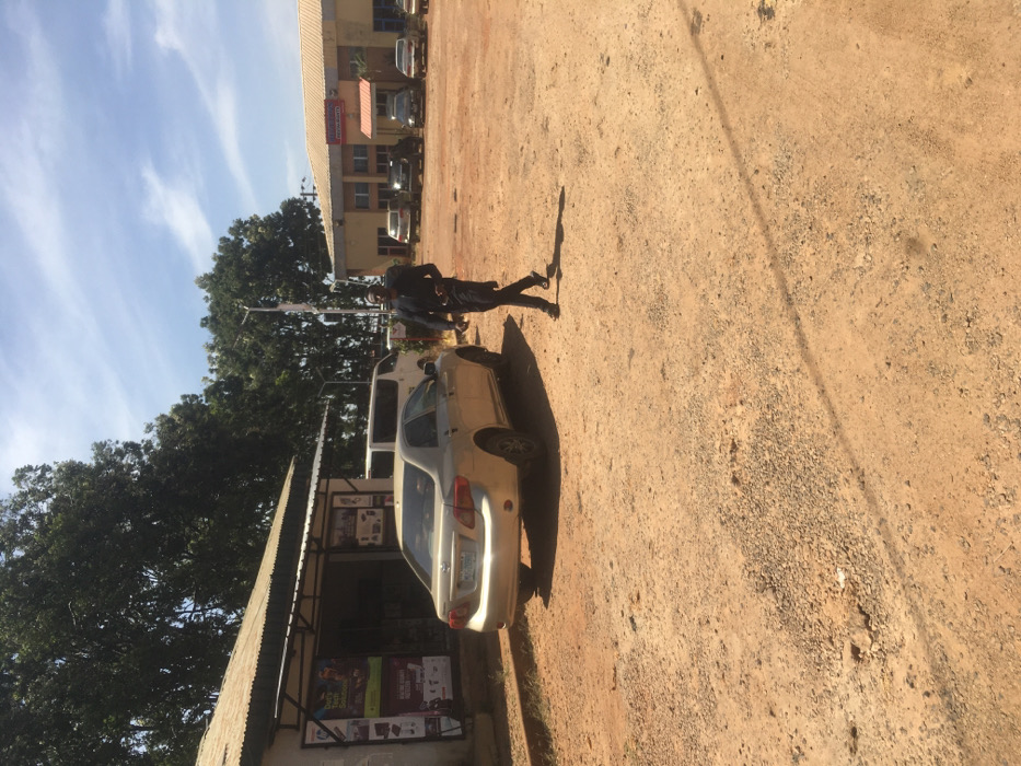 This image depicts an unpaved outdoor commercial area in Jos, Nigeria, under bright daylight with a partly cloudy sky. The foreground consists of reddish-brown dirt and gravel with visible tire tracks. In the mid-ground, a dark-skinned adult male, wearing dark attire (long-sleeved top and trousers), walks from left to right, casting a distinct shadow. To his left, a light-gold Toyota Corolla sedan is parked facing away from the viewer on the dirt ground, adjacent to a single-story building. This building has a corrugated metal roof and an awning, with storefront displays featuring "Digital Tech Solutions" and images of electronic devices. A white passenger van is partially visible behind the sedan. Further to the right, in the background, stands a larger, multi-story building with yellow walls and a reddish-brown roof. A red sign, partially legible as "PRESIDENT," is mounted above its entrance. An unpaved parking lot in front of this building contains several parked vehicles, including sedans and SUVs of various colors. Tall, dense green trees are visible in the background, lining the area behind both buildings. A tall pole with a white flag or banner is situated between the two main structures.