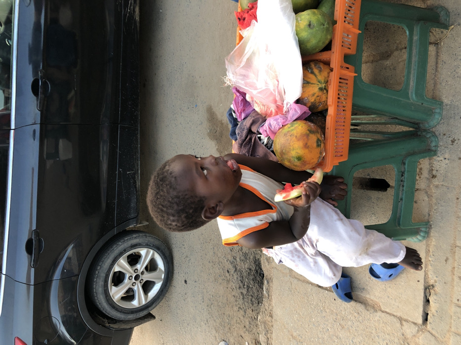 A young child sits on the ground with an outstretched tongue, holding a slice of watermelon. The child wears a white and orange tank top and white pants, with blue sandals on their feet. Beside the child, a black car is parked. A green plastic crate full of fruit rests on a set of green stools. A white plastic bag covers the fruit. The setting appears to be outdoors.