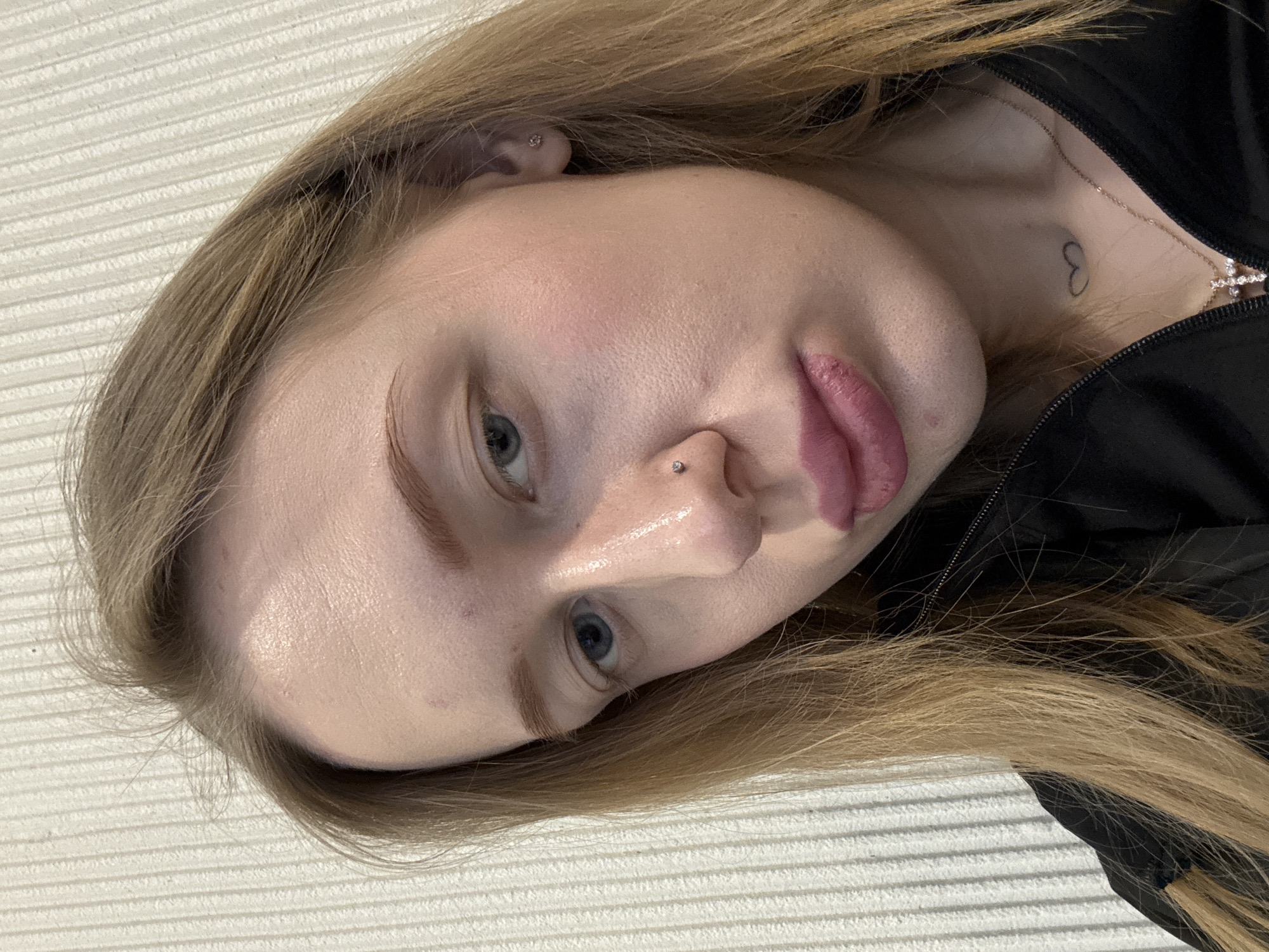 A close-up, tilted portrait shows a young woman with light skin and light brown hair. She has blue eyes, noticeable eyebrows, and a nose piercing. Her lips are colored pink. A small heart tattoo is visible on her chest, along with a necklace featuring a cross. She is wearing a black zippered garment. The background appears to be a white textured surface. There is no indication of location in Ovoshchnoy, Russia or any city.