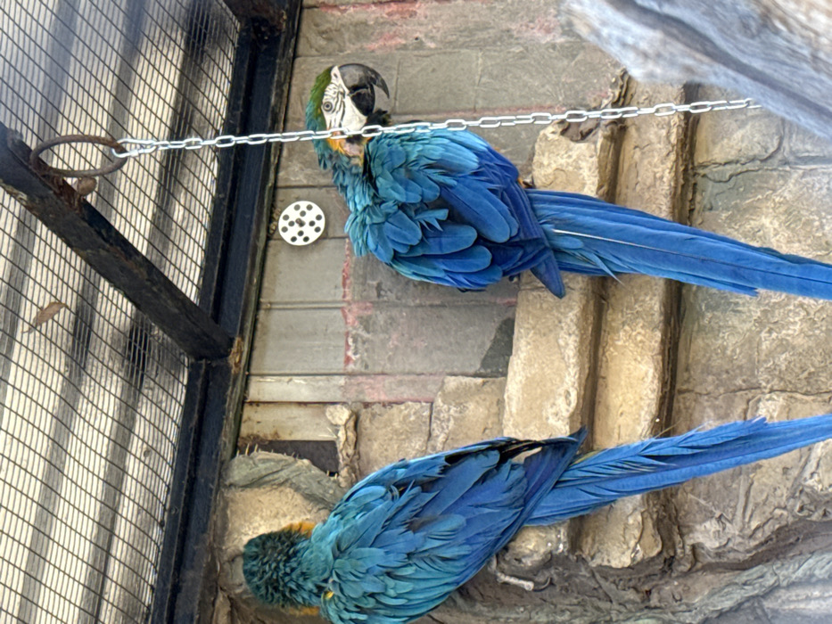 This image depicts an aviary enclosure in Shakhty, Russia. Two Blue and Gold Macaws (Ara ararauna) are prominently featured, perched on artificial rock formations within the enclosure. The macaw on the left is positioned with its back to the viewer, exhibiting primarily blue plumage with a long tail, and hints of yellow feathers near its neck. The macaw on the right is oriented in profile, facing left, displaying its blue and yellow body feathers, a distinctive white facial patch with black lines, and a dark beak. Above the birds, a metal mesh ceiling structure and a dark wooden beam are visible. A silver-colored metal chain hangs vertically from a ring attached to the wooden beam in the upper right quadrant, extending downwards. A white circular object marked with seven black dots, arranged similarly to a dice face, is affixed to the textured wall behind and between the two macaws. The overall background consists of simulated rock textures and vertical panels.