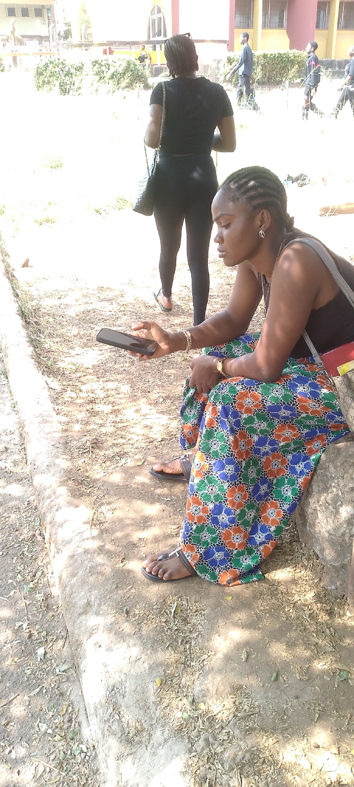 The image depicts an outdoor scene in Nsukka, Nigeria, likely on a university campus or a public walkway