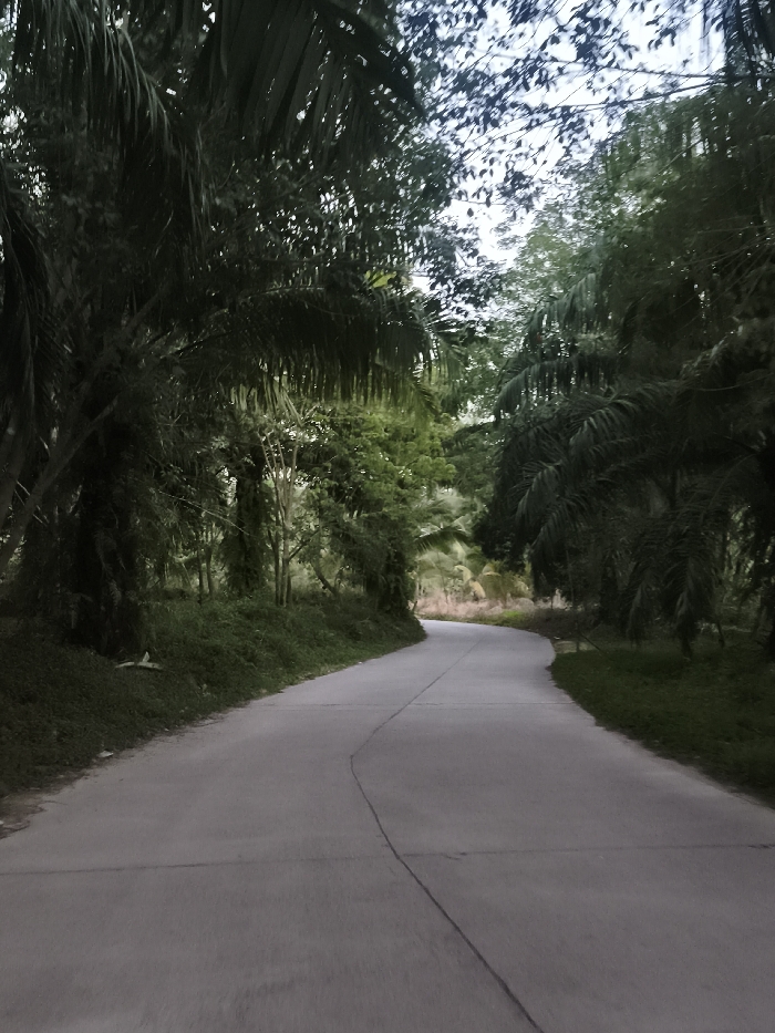 A concrete road, light grey with visible expansion joints, winds through a dense tropical jungle landscape in Ko Samui, Thailand. The road curves left into the distance. Lush green vegetation, primarily tall palm trees and various broadleaf trees, forms an archway overhead and borders both sides of the road, extending to the immediate foreground where grass and undergrowth are present. Diffused light filters through the canopy, illuminating the scene. No individuals, vehicles, or other identifiable objects are visible.