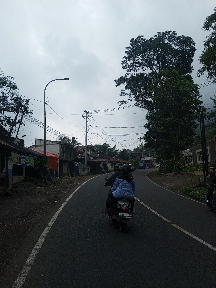 The scene depicts a street in the city of Sandamal Eliya, Sri Lanka, under an overcast sky. A two-lane asphalt road, marked with a solid white line on its left edge and a broken white center divider, curves gently to the right, receding into the distance. In the foreground, two individuals on a white scooter are traveling away from the viewer. The passenger, wearing a light blue checkered shirt and a dark helmet, is seated behind the driver, who also wears a dark helmet and dark clothing. The passenger's right foot, visible on the scooter's footrest, is bare. The scooter's rear license plate is partially visible, displaying "F 8812 YM". A second motorcycle, partially visible on the far right, also appears to have at least one rider. Along the left side of the road, a dirt shoulder fronts a series of single-story buildings, some appearing residential and others commercial. One building displays a light blue and white sign with unreadable text, while another is partially covered by an orange tarp. A tall, black streetlight pole with an attached luminaire extends over the road from the left. Numerous utility poles of varying materials (wood and concrete) are positioned along both sides, supporting a dense matrix of overhead wires that crisscross the sky. Dense green foliage from large trees and bushes flanks both sides of the road, with a particularly tall, leafy tree dominating the upper right portion of the frame. The sky is uniformly light grey, indicating an overcast condition.