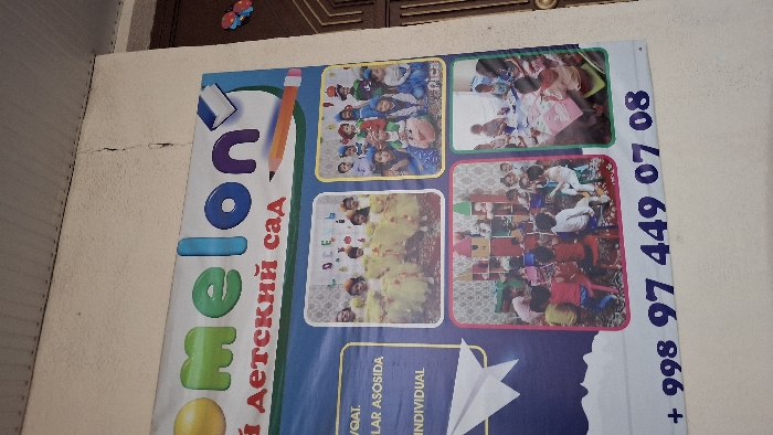 An outdoor advertising banner for a kindergarten is displayed on a light beige, textured wall exhibiting vertical cracks in its upper section. The banner features the partially visible name "Omelon" and the Russian text "Детский сад" (Kindergarten) in colorful letters, along with graphics of a blue book, an orange pencil, and a white paper airplane. Four illustrative photographs of children are embedded within the banner: 1. **Top Left:** Six young children, mostly girls, in yellow dresses and headpieces, posing indoors. 2. **Top Right:** Approximately seven children in various costumes (e.g., mermaid, chef, animal) sitting together on an indoor floor. A "Pica" watermark is present. 3. **Bottom Left:** Several children seated on small colorful chairs at low tables, playing with toys in an indoor setting. 4. **Bottom Right:** A group of children seated at a low table, engaged in drawing or coloring activities. Below these images, the contact phone number +998 97 449 07 08 is prominently displayed. Partial text fragments, likely in Uzbek, such as "VOVAT.", "LAR ASOSIDA", and "INDIVIDUAL", are visible on the left side of the banner. To the right of the banner, a dark brown door with patterned geometric panels and butterfly-shaped decorative elements is partially visible. A white slatted soffit is present at the top of the frame. This scene is located in Tashkent, Uzbekistan.
