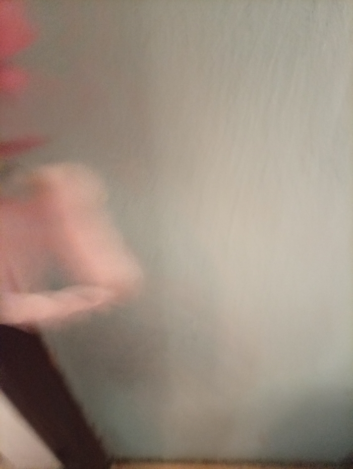 The image depicts an extremely blurry and indistinct indoor scene, located in the city of Ikeja, Nigeria. The visual information is heavily obscured by motion blur and lack of focus. On the left side of the frame, several blurred forms suggest the presence of a person. The upper left quadrant contains a diffuse reddish-pink blur, possibly part of clothing. Below this, a lighter, flesh-toned blur is present, consistent with a human arm or torso, indicating movement. Further down and to the left, a dark, elongated shape extends diagonally, likely representing a leg clad in dark trousers. The majority of the background and midground consists of a uniform, light greenish-gray or light beige surface, resembling a textured wall. At the very bottom edge of the frame, a narrow horizontal band of darker, brownish color suggests a floor surface. No specific objects or interactions are clearly discernible due to the severe blur. The overall scene conveys an impression of rapid movement captured in a poorly focused photograph.