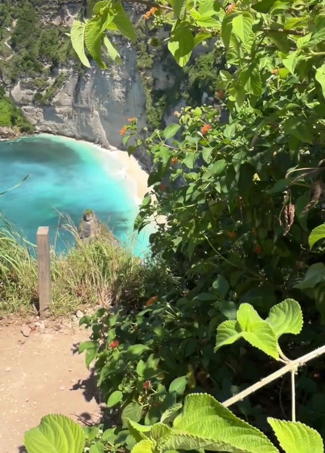 The camera starts focused on green leaves and then slowly pans out and up to reveal a beautiful tropical cove in Bali. The cove has white sand, turquoise water, tall cliffs and lush green vegetation. There are a few people on the beach. The camera stays still for a moment at the end to take in the view. The weather looks warm and sunny.