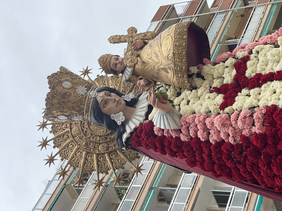 A large, ornate religious statue depicting the Virgin Mary and the Infant Jesus is prominently displayed outdoors in the city of Paiporta, Spain