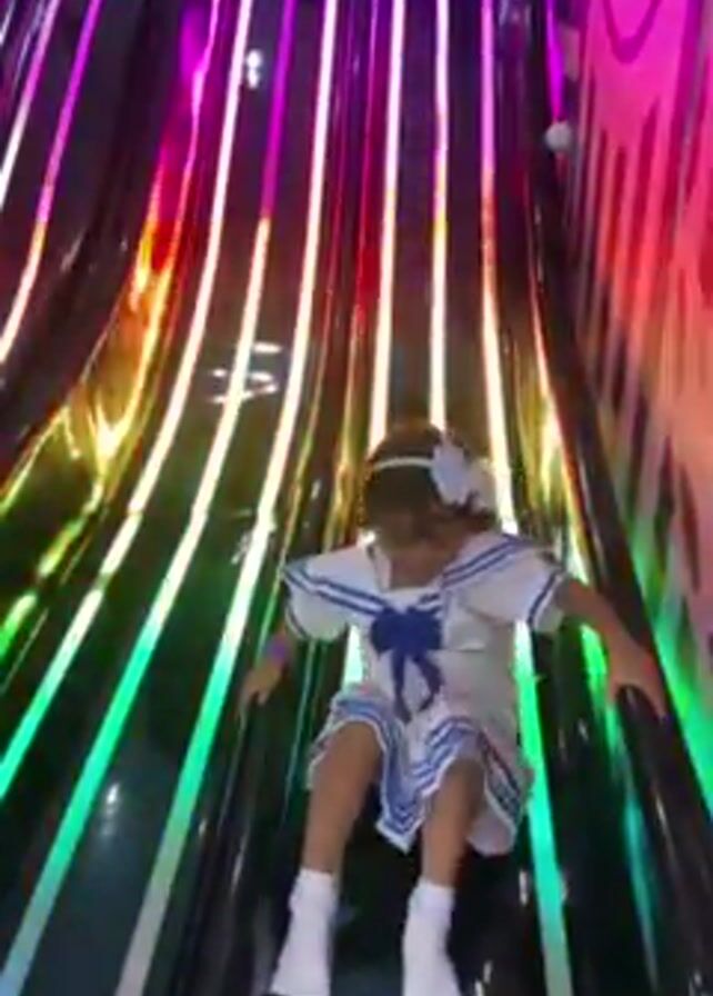 A young girl wearing a blue and white sailor dress with matching bow slides down a brightly lit, rainbow-colored slide into a pit filled with light blue and white plastic balls