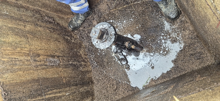 The image depicts an overhead view into a concrete utility chamber, likely situated in Baisieux, France. The chamber features rough, stained concrete walls, predominantly dark brown with yellowish streaks and dirt accumulation. The floor is covered in dark, muddy soil and debris, with standing murky greyish-white water and significant white foamy residue concentrated around a central metal valve assembly. The primary subject is a black, corroded metal valve, approximately cylindrical, protruding vertically from the muddy floor. Its uppermost section is a circular flange with a prominent square-shaped operating nut in the center, intended for a wrench or key. Several smaller pipes, valves, and fittings are attached to the side of the main valve body. White foam and water droplets adhere to the valve's surface, indicating recent interaction with liquid. In the upper right and lower right portions of the frame, the lower legs and feet of an individual are visible. The person wears dark, rugged work boots with textured soles and blue work trousers, featuring a distinct horizontal reflective stripe near the ankle. The presence of the individual and the foamy liquid suggests the valve is either being operated, inspected, or undergoing maintenance, such as cleaning or flushing. The overall environment is wet, dirty, and indicative of an industrial or municipal infrastructure setting.