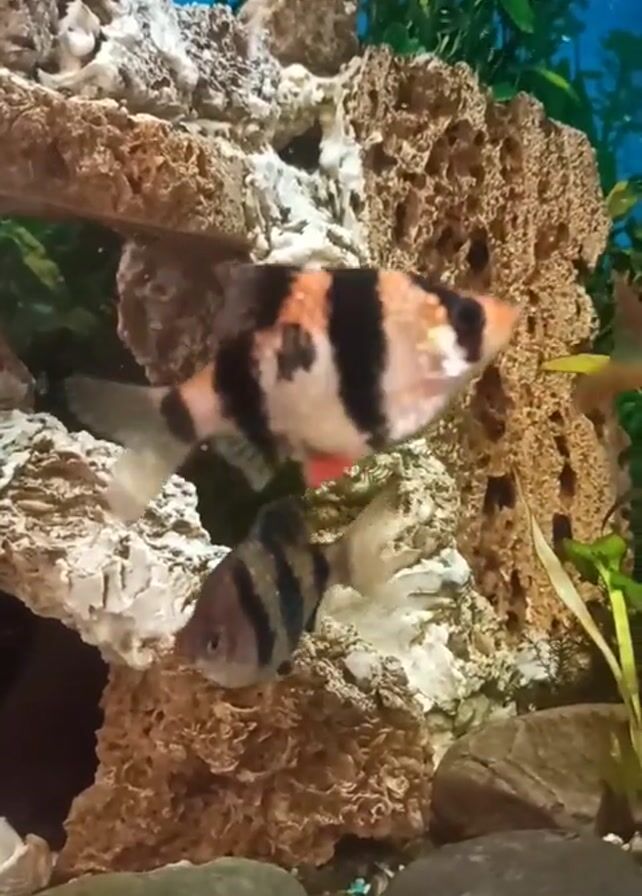 n aquarium with several harlequin rasbora fish swimming amidst the decorations. The fish are brightly colored, featuring white, black, orange, and red patterns. The aquarium features a rocky structure, some greenery, and a substrate composed of gravel, stones, and colorful small pieces. The water appears clear. The rocks are varied in color and texture. One rock formation has a dark opening. The plants, though visible, are somewhat out of focus.