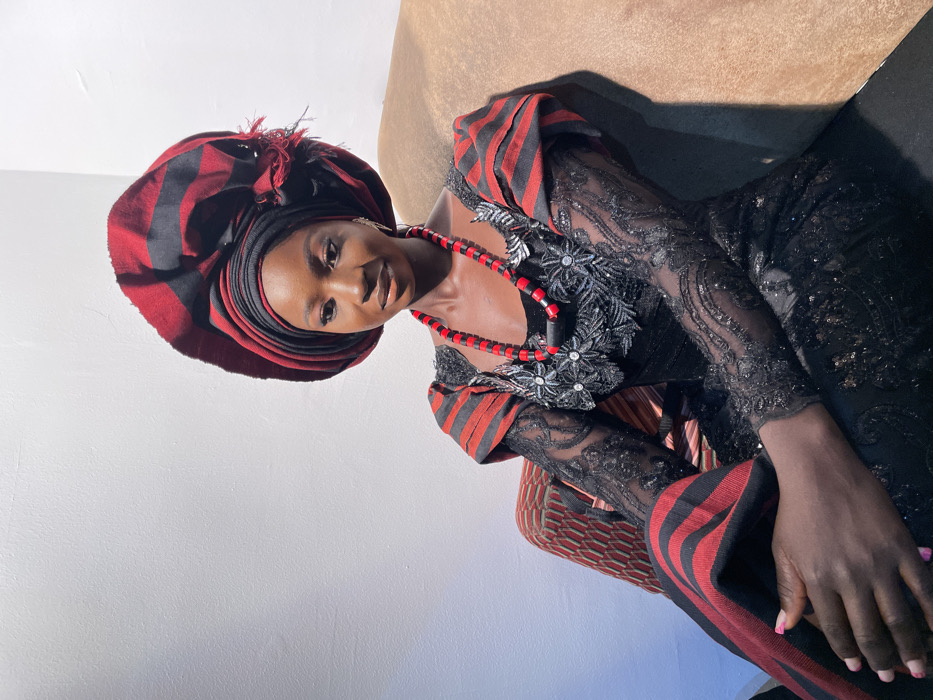 A woman in traditional attire sits in a partially angled view. She wears a large, red and black striped head wrap with feathery accents, complementing a matching dress with sheer sleeves and floral embellishments. A red beaded necklace adorns her neck. She is seated on a textured chair, one arm resting on it. A white wall creates a bright backdrop.