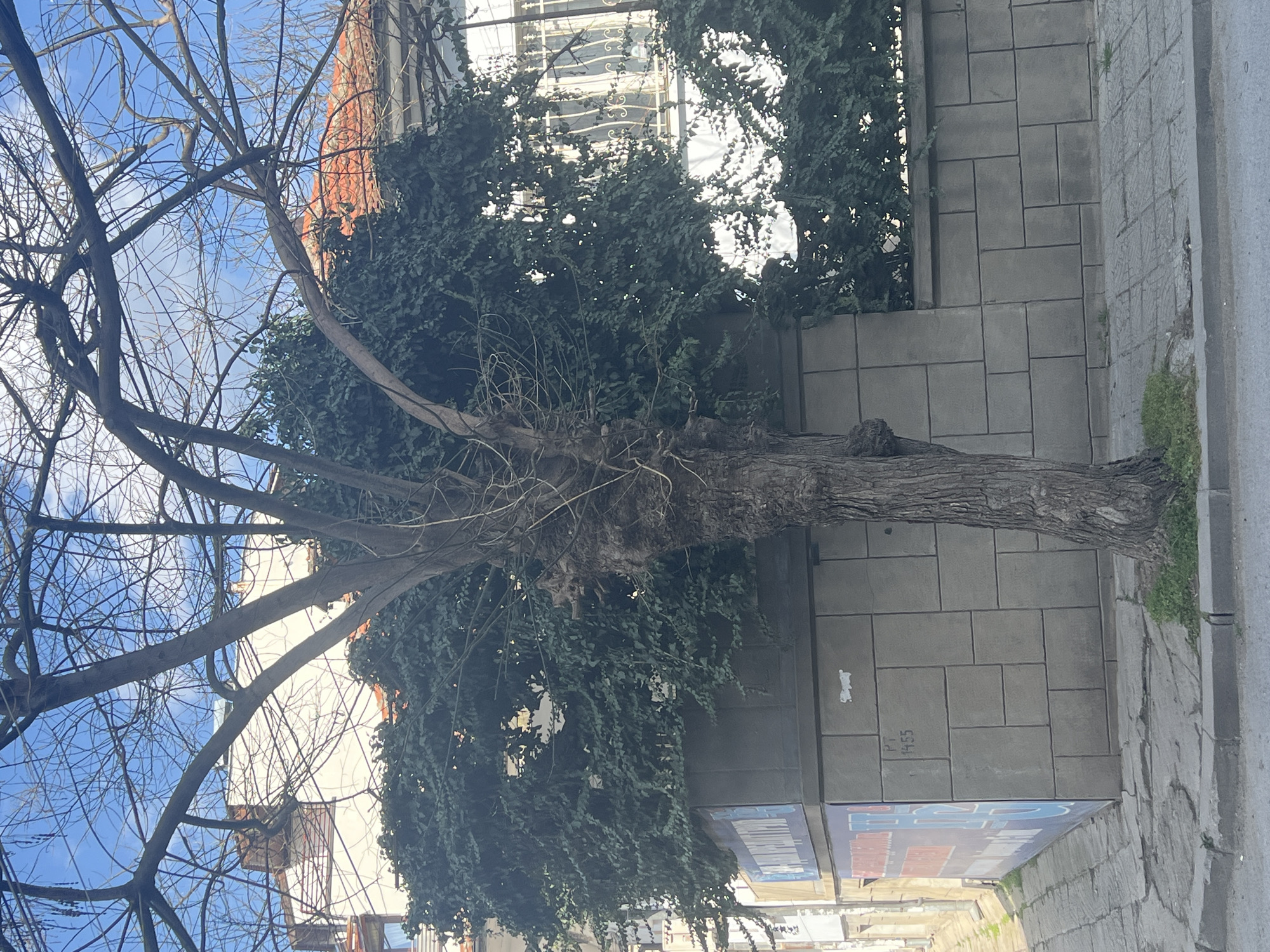 The image displays an urban outdoor scene in Yambol, Bulgaria, under a clear blue sky with scattered white clouds. A prominent deciduous tree with a thick, dark, textured trunk and numerous bare branches dominates the central foreground. Its base rests on a small patch of grass within a cracked grey concrete sidewalk. The sidewalk is bordered by a grey concrete curb and a section of asphalt road at the bottom. Behind the tree and to its right, a substantial wall constructed from rectangular grey concrete blocks is visible. The faint text "PT 1455" is inscribed on one of these blocks. Dense, dark green foliage, appearing as a thick hedge or ivy, grows over and behind this wall. To the left of the tree, a building corner is partially visible, featuring faded blue and red poster-like advertisements. In the background, through the bare tree branches and dense foliage, sections of light-colored buildings are discernible. These include windows, one of which has an ornate white security grille, and areas of orange-tiled roofs. No individuals or discernible actions are present in the scene.