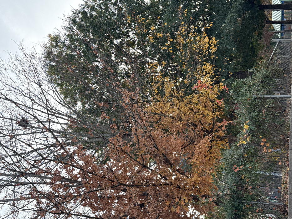 A view of trees in varying stages of autumn. One tree is bare with a nest visible in its branches. Another displays brown leaves, while a third exhibits yellow foliage with a few red accents. Lush green trees appear behind and to the side, indicating some trees retain their leaves. A chain-link fence and glimpse of a building are along the right edge. Overcast skies fill the background.