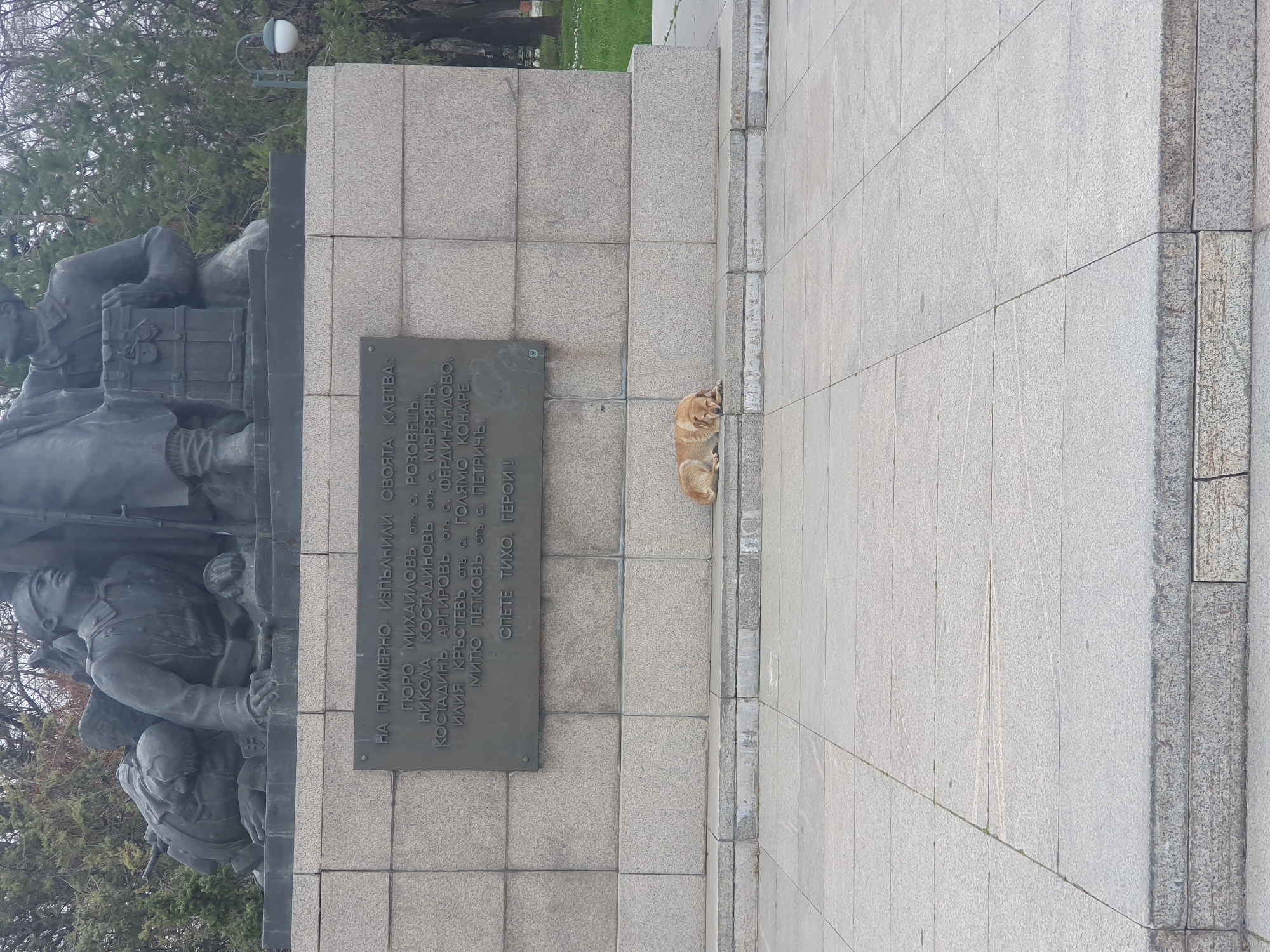 monument in Plovdiv, Bulgaria, with a bronze plaque that commemorates the soldiers who fulfilled their oath. The plaque is inscribed in Bulgarian Cyrillic script. A light-colored dog is sleeping on the stone platform next to the monument. The scene is set on a cloudy day. Trees are visible in the background. The monument appears to be located in a park or public space in Plovdiv.