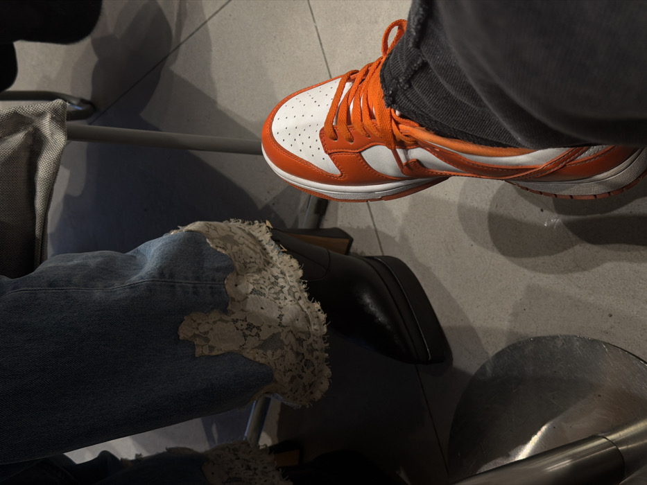 two people sitting on chairs in an indoor setting. One person is wearing a pair of orange and white Nike Dunk sneakers, paired with dark gray jeans. The other person is wearing light blue jeans with lace embellishments at the bottom, matched with black boots. The floor is a light gray, and the chairs appear to be made of metal and fabric.