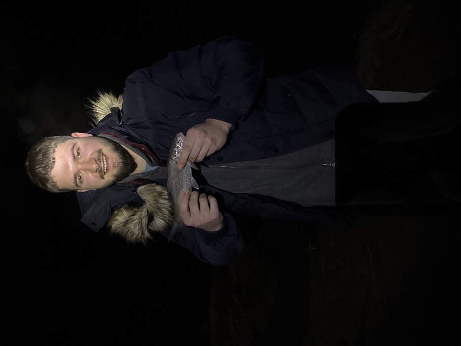 A young adult male, with a light complexion, dark hair, and a beard, is depicted smiling and holding a silver-scaled fish with both hands. He is positioned centrally against a dark, indistinct background, suggesting an outdoor nighttime setting in Unknown, Unknown. He wears a dark blue padded winter jacket with a light brown fur-lined hood, a grey zippered hoodie, and a light blue crew-neck shirt. A thin, reddish-pink string bracelet is visible on his right wrist. The fish, approximately 8-10 inches long, is held horizontally, with its head to the right.