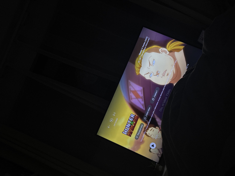 The image displays an indoor scene in Villecresnes, France, characterized by low light conditions. A television screen, positioned at an upward angle from the viewer's perspective, dominates the lower half of the frame. The screen is displaying content from the anime series "Hunter x Hunter (2011)," specifically Season 1, Episode 6, titled "Une épreuve étonnante" (A Surprising Trial). On-screen, the title "HUNTER x HUNTER" is visible on the left. User interface elements in French include "OPTIONS," playback controls (back, play/pause, forward), and interactive prompts such as "Pas pour moi," "J'aime bien," and "J'adore!" A feedback message states, "Vous appréciez ? Votre évaluation nous aide à déterminer si nous devons vous recommander ce type." A subtitle at the bottom reads, "Dis, m'sieur Todo." Two animated characters are depicted: a male character with blond hair, a ponytail, blue eyes, a nose ring, and a robust build occupies the right side of the screen, while a smaller, brown-haired male character is partially visible on the left. Timestamps "20:25" and "02:14" are also present. The bottom edge of the screen is partially obscured by a dark, indeterminate soft object, likely bedding, suggesting a person is watching from a recumbent position. The upper portion of the image is dark, revealing faint vertical patterns consistent with window blinds or curtains.